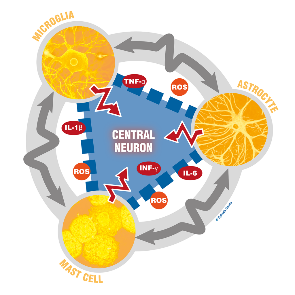A neuroinflammatory cross-talk is progressively activated between microglia, astrocytes, and mast cells, with potential neurodegenerative damage.